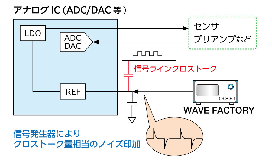 ADコンバータ、DAコンバータなどのアナログICはノイズに対して敏感です。アナログICのREF(基準電圧)端子は、IC内部で基準となる電圧をADCやLDOに供給することから、安定した電圧入力が必要ですが、実際はクロストークやグラウンドの揺れなどのノイズが入力に加わります。REF端子やBIAS端子にノイズを印加してアナログICがどの程度の耐性を持つかを確認します。試作時に検出されたノイズに対するアナログICの耐性を見る場合や、不具合発生時の真因を見つけるためのチェックなどに有効です。