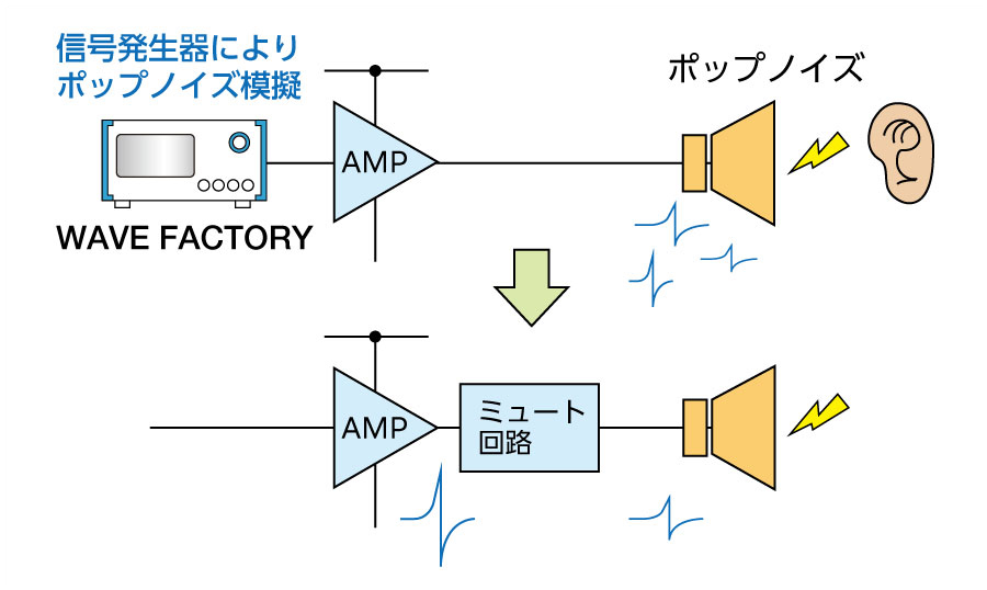 アンプ電源ON/OFF時には耳障りなポップノイズ(ブチッという音)を発生します。ポップノイズはミュート回路を付加すれば抑制可能ですが、抑制の度合いによって回路やコストが変わります。模擬信号を用いてミュート回路の仕様やテスト基準値の決定などが開発途中に行えます。