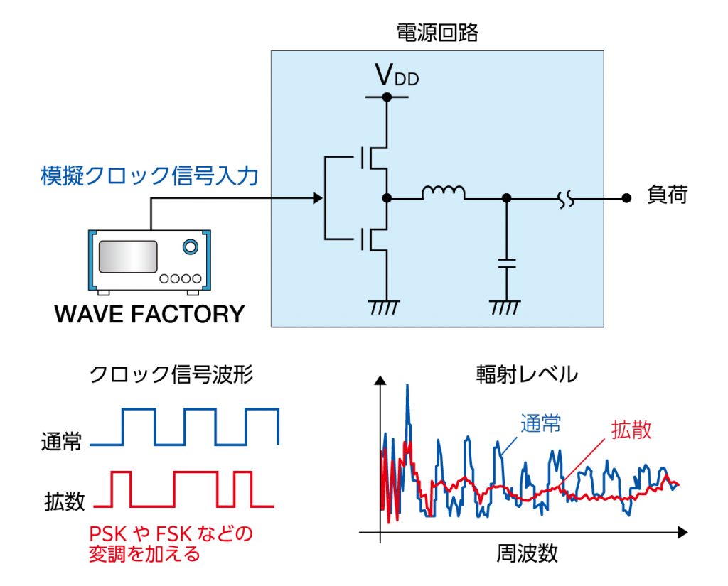 機器に内蔵されている電源のスイッチング周波数とその高調波は、電磁的に強いノイズ源になることがあります。スイッチング周波数を意図的に変動させて、このノイズを抑えるのが「クロック拡散」です。クロック拡散の機能を実装する前に、信号発生器を用いて有効性を確認できます。