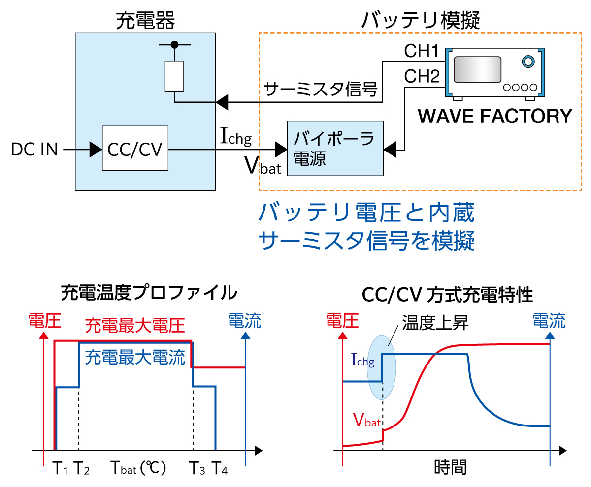 - サーミスタ信号が規定温度を超えた時、下回った時には、充電器からの電流値が変化することを確認 (CC/CV方式充電特性)。