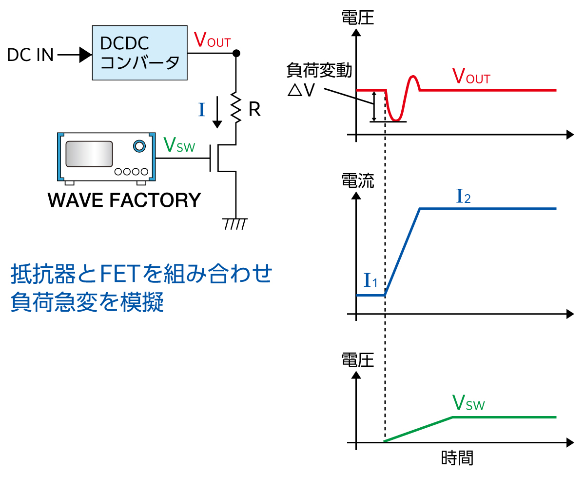 - 抵抗器およびFETで試験回路を構成し、WAVE FACTORYからFETのゲート電圧Vswを入力する。