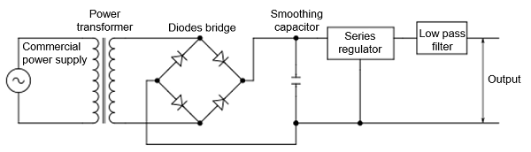 The linear regulator type system supplies the output voltage with high stability and low noise by using the series regulator. However, its efficiency is poor because all the voltage difference between the input and output is consumed as heat. Series regulators include band-gap type and Zener type, and each has unique characteristics in terms of output current, noise performance, and stability.