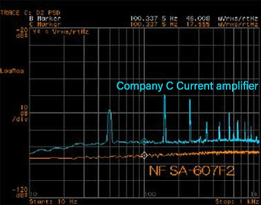 Since the current amplifier of company C has a built-in power supply, hum noise is easily mixed.