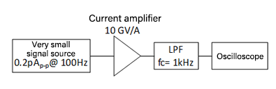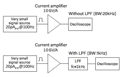 The output waveforms with and without a low-pass filter (LPF) (1-pole, fc = 1 kHz) to the output of the current amplifier are shown in Figure 11. By using LPF, it is seen that the noise is reduces and the output waveform become very sharp. In this way, by setting only the signal of the band to be measured by a technique such as filtering, S/N ratio can be improved and a smaller current signal can be detected. In addition, as an actual measurement example, a 1-pAp-p real-time signal was successfully detected using SA-607F2.