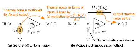 A simplified version of an amplifier with a typical input impedance of 50 Ω is shown in Figure (a). As for this method, 50 Ω thermal noise connected to the input is mixed with the signal, amplified, and output. For that reason, it is impossible for thermal noise to fall below that due to 50 Ω resistance, even in the case of an ideal amplifier without internal noise. The method for breaking through this “50 Ω wall” is the active input impedance method shown in Figure (b). Instead of removing the terminating resistors, input impedance is created with a negative-feedback (NF) resistor.