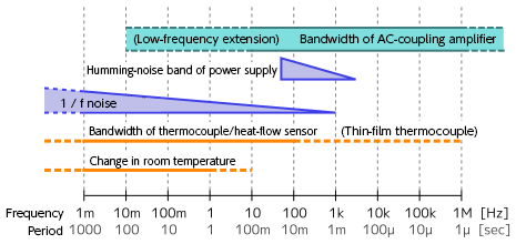 On the other hand, in other applications, instantaneous heat transfer is detected by using a device that can respond quickly, such as a heat-flow sensor or a thin-film thermocouple. For high-speed signal detection, an AC-coupling preamplifier can also be used because the output in thermal-equilibrium state (heat transfer does not occur) is a DC component, and the desired information is only acquired in the moment that it is unbalanced (heat transfer occurs).