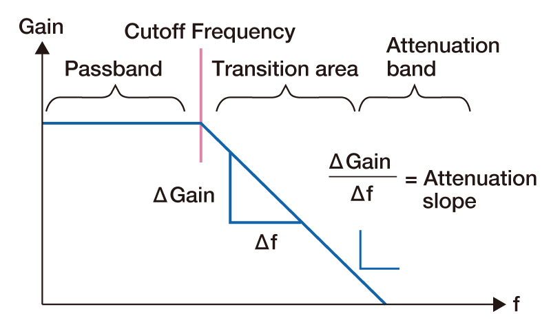 The attenuation gradient is the value of the attenuation characteristic in the transition band. It is the amount of attenuation per unit frequency, and one octave (double the frequency) is often used as the unit frequency.