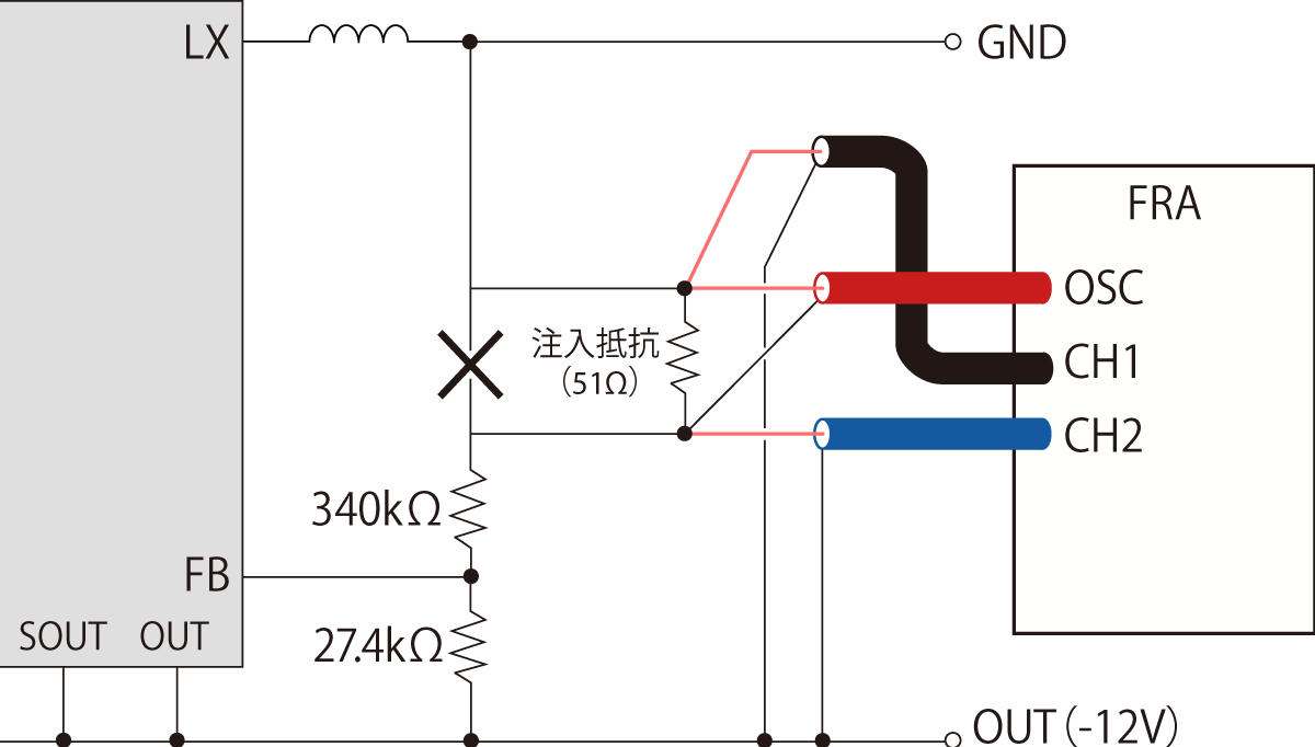 右図のように、負帰還回路の一部に信号を注入しますが、測定するCH1およびCH2の測定基準は、制御ICの電位基準(ここではSOUT)に結線します。この制御ICは、SOUT端子とFB端子の間の電圧が一定になるよう動作します。