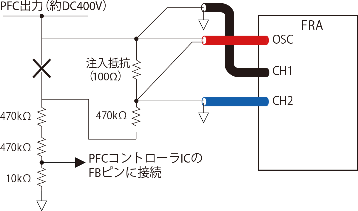 • PFC回路は高電圧出力であることが多く、測定器以外のケーブル等にも注意が必要です。高圧に対応した高耐圧クリップセットなどを使用してください。