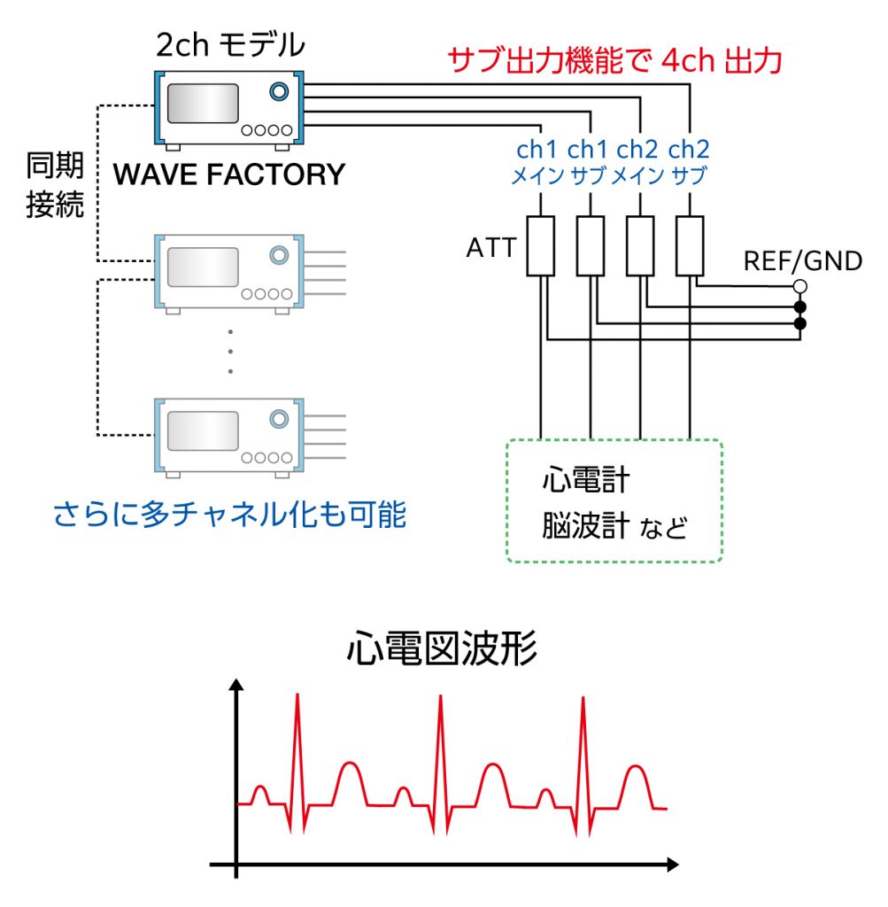 - 2chモデルのサブ出力機能を用いることで、同期のとれた心電図波形4出力が得られる。