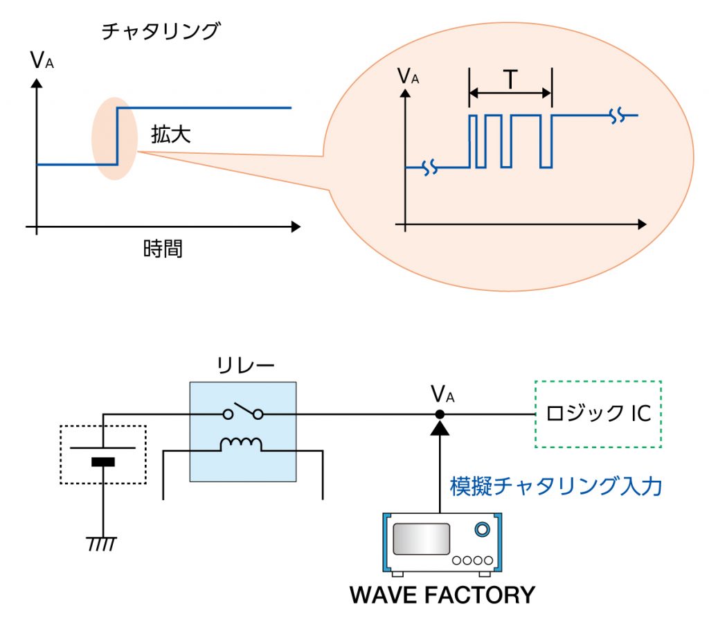 スイッチやリレーをONにすると、接触状態が安定するまでに機械的振動を起こし、短時間でON/OFを繰り返すことがあります。一般にチャタリングと呼ばれる現象です。 このチャタリングの影響や、チャタリング対策の効果検証を信号発生器を用いて行う事ができます。