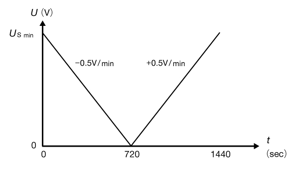 【試験】:変化速度(0.5±0.1)V/分として、電源電圧をUS minから0Vに減少させ、次に電源電圧を0VからUS minへ増加させる。