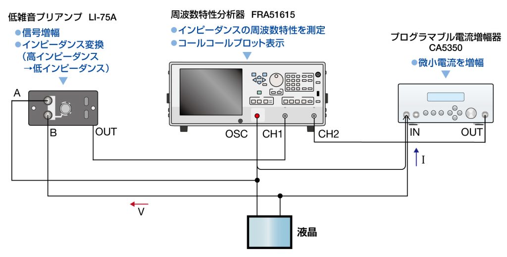 液晶が高インピーダンスであるため、測定電圧は低インピーダンス出力の電圧アンプを使用することで安定した測定が可能です。 - 微小電流を増幅する電流アンプ