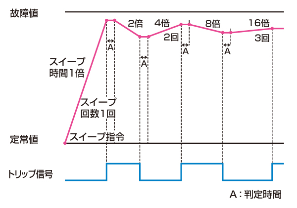 保護リレーの動作時間による計測値のずれをできるだけ小さくするため、定常値と故障値の間のスイープ速度を減速(時間を増加)しながら、繰り返しスイープを行い、より正確な動作値を計測します。