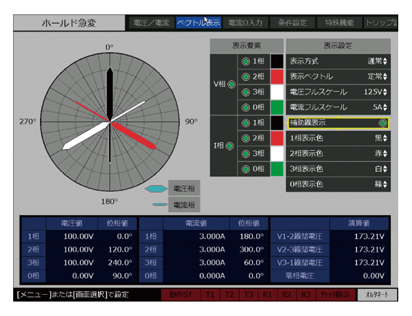 ベクトル表示機能は、各相の電圧電流設定の振幅および位相をベクトル表示します。さらに1相~3相設定を対称座標法で変換してベクトル表示することも可能です。
