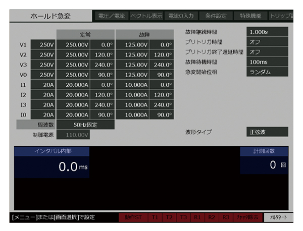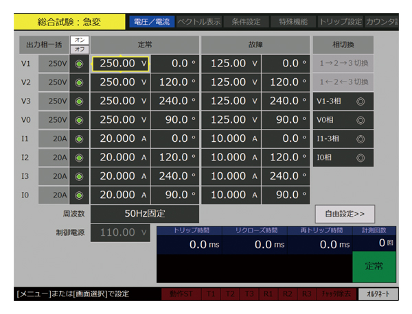 - 定常およびステップ1~10の各ステップで、電圧・電流各相の振幅・位相を自由に設定