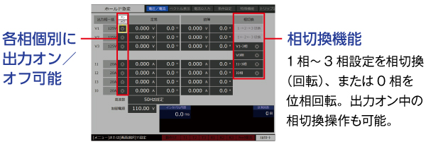 さらに、電圧4相・電流4相の多相出力で、制御線の動作確認など多様な試験に対応しています。