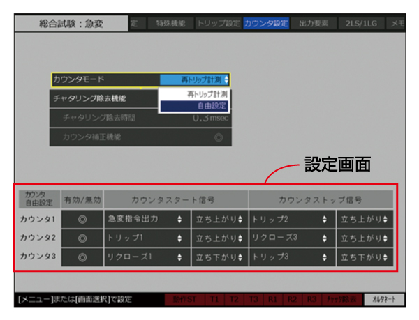 トリップ1~3 を同時に測定したいなどの要望に対応し、カウンタ1~3 のスタート信号/ストップ信号を任意に設定可能なオプション*を用意しました。