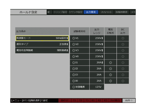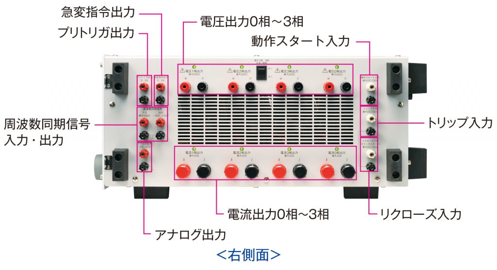 相あたり最大20A(10V)、4相並列で80A(10V)、2相直列で20A(20V)を2相、4相直列で20A(40V)の電流を出力できるので、旧式の87リレー(比率差動継電器)や51リレー(過電流継電器)の試験を行うことも可能です。