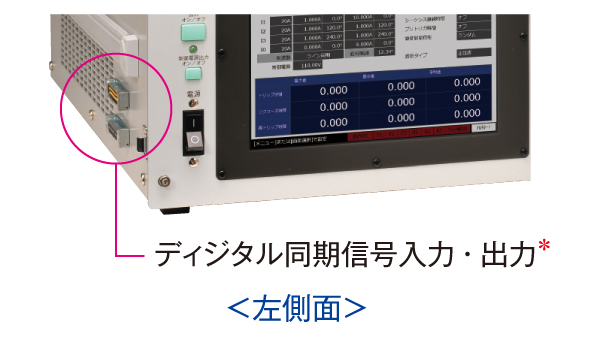 50Hz 固定、60Hz 固定、内部可変(10.000Hz~500.000Hz)、0 相別設定、外部同期、ライン同期より選択。オプションで、周波数同期用のディジタル信号入力・出力を追加できます。*