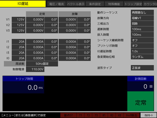 急変動作の試験用にタイムカウンタを内蔵。保護リレーの動作時間・復帰時間(動特性)などを計測でき、計測結果は、試験結果メモリに保存可能です。単体試験では、インタバル内部/ワンショット/トレイン/動作・復帰/インタバル外部の5モードから選択、総合試験では、トリップ時間、リクローズ時間、再トリップ時間を計測します。また、チャタリング除去機能も備えています。