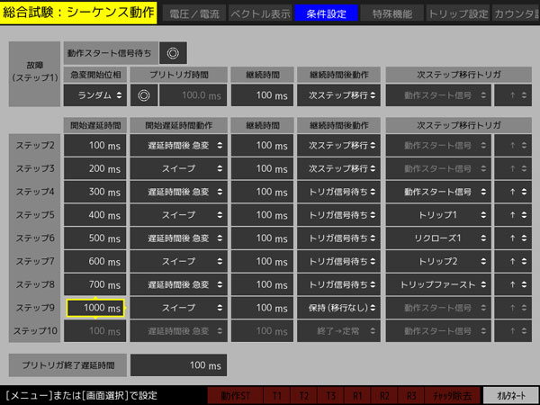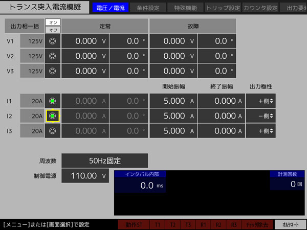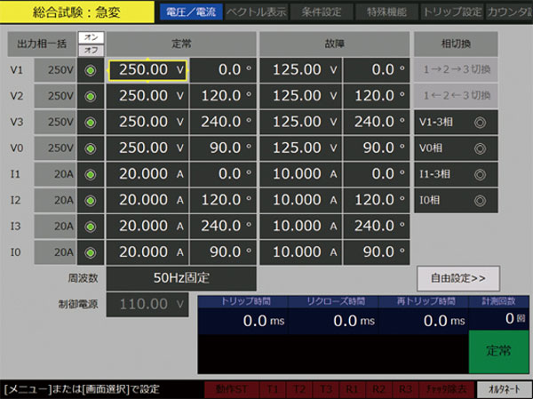 - 定常およびステップ1~10の各ステップで、電圧・電流各相の振幅・位相を自由に設定