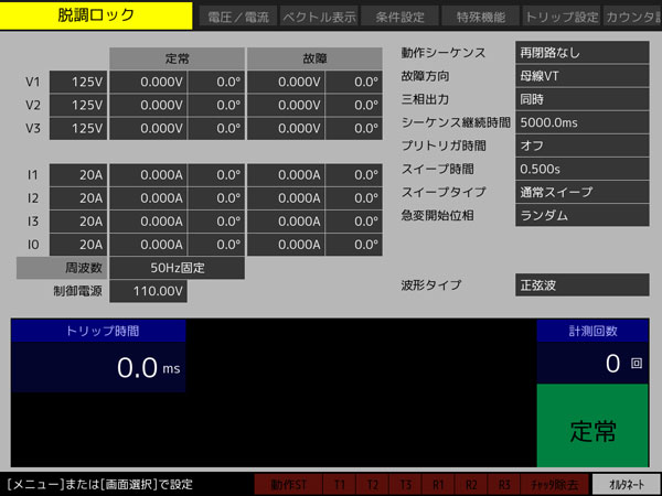 | 総合試験 | 急変動作、過渡波形再生 (コムトレード書式対応)、リアクタンス協調*、脱調ロック*、脱調ロック解除*、I0 遅延*、シーケンス動作モード* |