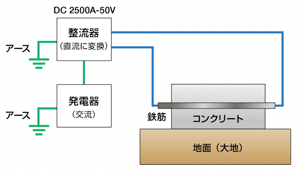通電システムとしては非常に単純で、鉄筋の両端に接続金物を取り付け、直流電流を印加します。