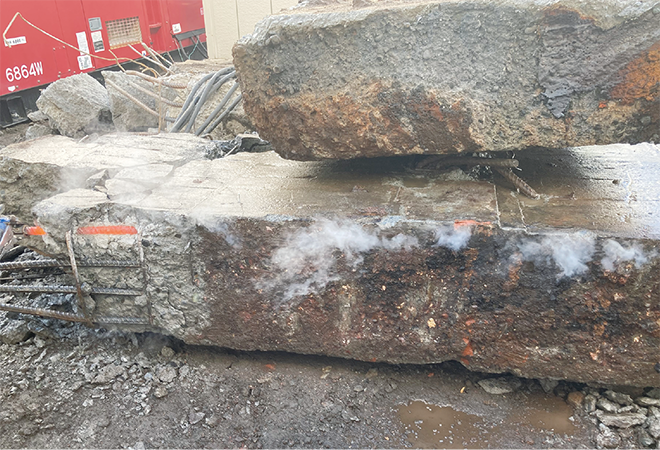 加熱により鉄筋やコンクリートが膨張し、コンクリートにひび割れを発生させることで、コンクリートと鉄筋の付着強度を低下させ、解体作業を容易にする解体補助工法です(マスホット工法*)。