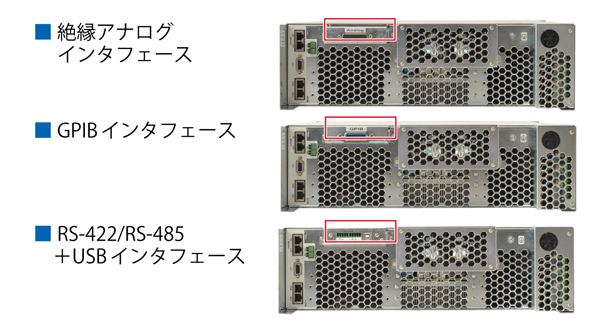 LANインターフェース(LXI準拠)を標準装備。オプションで、絶縁アナログ、GPIB、RS-422/RS-455+USBインターフェースのいずれかを装備可能です(ご注文時指定)。