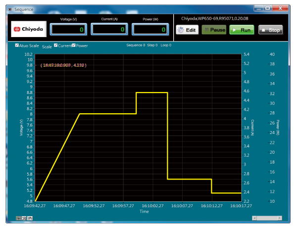 電圧・電流・電力、時間などのパラメタをプログラムして順次出力します。また、PC に保存したシーケンスを任意の順番で実行することも可能です。グラフ表示を確認しながら、複雑なシーケンスパターンを容易に作成できます。