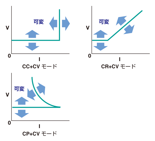 定電流(CC)、定抵抗(CR)、定電圧(CV)、定電力(CP)に加えCC+CV、CR+CV、CP+CVの各モードを装備。