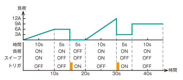 任意に設定したシーケンスパターンで、複雑な試験や高速シミュレーションが可能な機能です。最大1000ステップで、ノーマルシーケンスとファストシーケンスの2種類の機能を装備しました。ノーマルシーケンスでは負荷値、実行時間、応答時間(スルーレート)をステップごとに独立して設定できます。