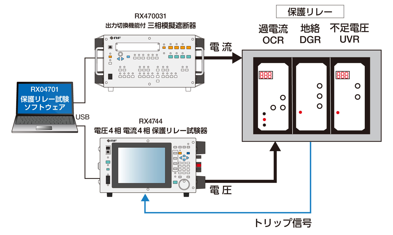 - RPR (逆電力継電器) 自家消費型太陽光発電システムで、逆潮流を防止 ▶ RX47022なら 微小電流出力により、CTなしで試験が可能