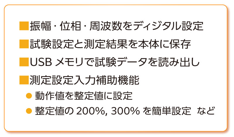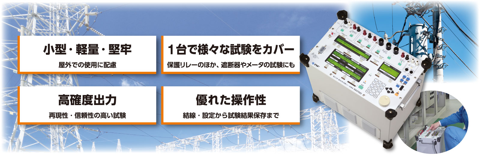 電圧4相 電流4相 保護リレー試験器、出力切換機能付 三相模擬遮断器、さらに試験用ソフトウェアを組み合わせることで、小型・軽量で多機能な保護リレー試験システムを構築できます。