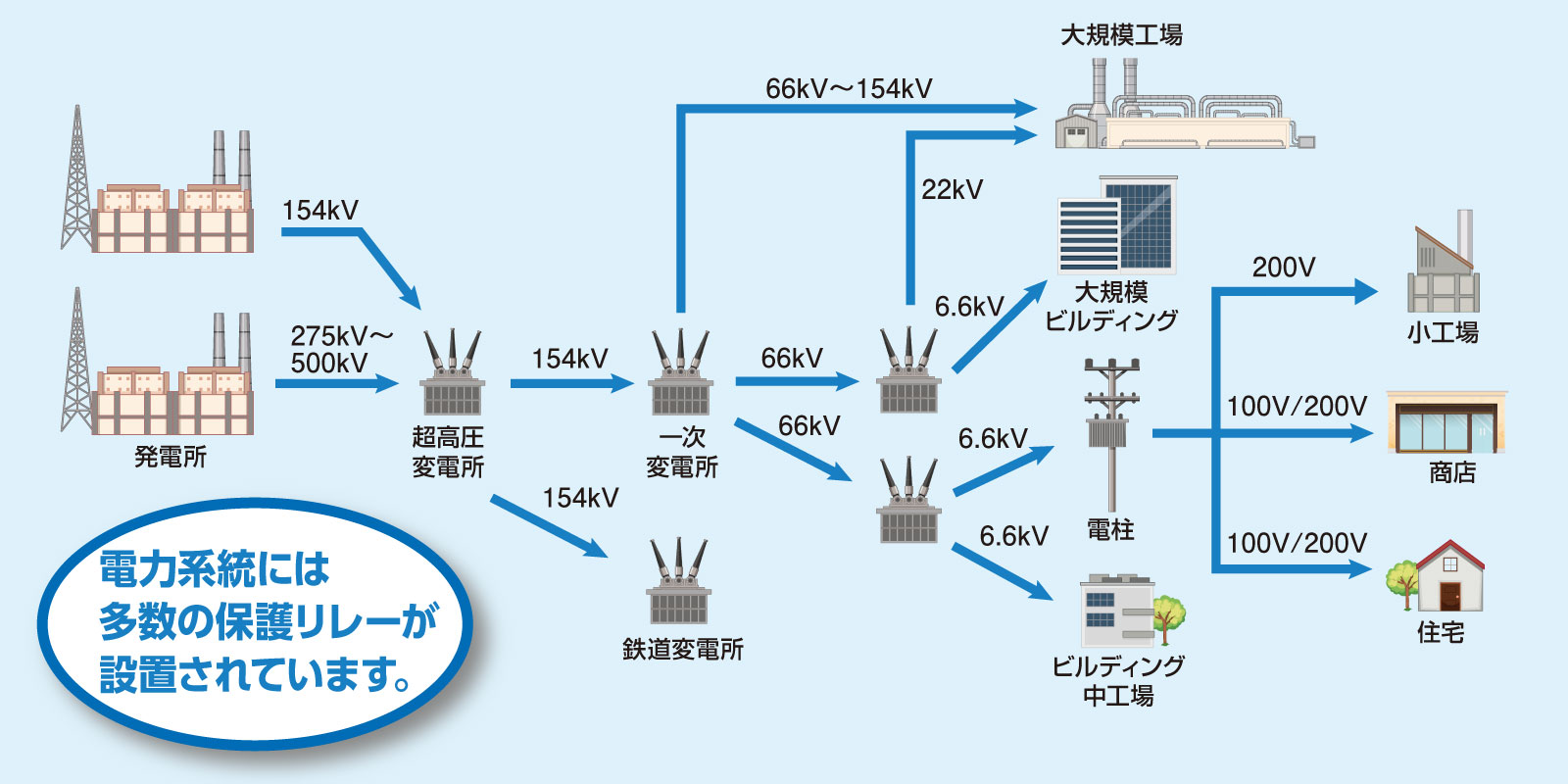 発電所、変電所、配電まで、多数の保護リレーが設置されています。安全で安定した電⼒供給に不可⽋の装置です。