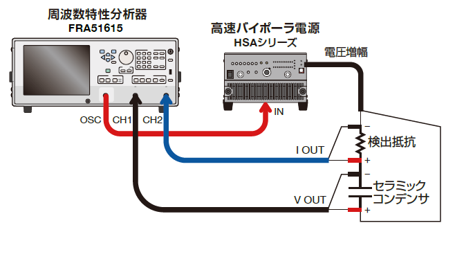 - 周波数掃引させた交流信号をバイポーラ電源で増幅して、セラミックコンデンサに印加し、静電容量の周波数特性を測定します。