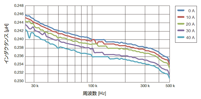 - インダクタに直流バイアス電流を流すと、磁気飽和により、透磁率が低下してインダクタンス値が低下していることが観測できます。