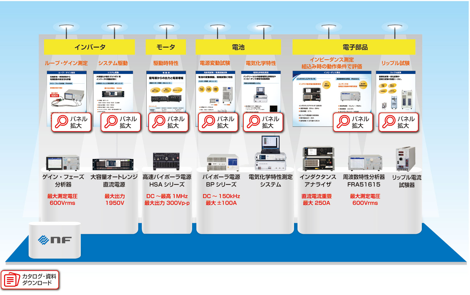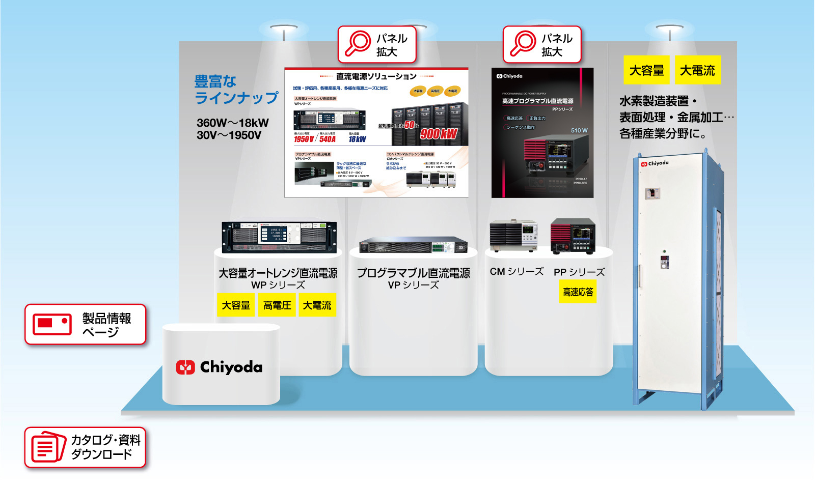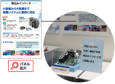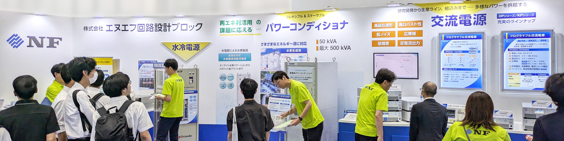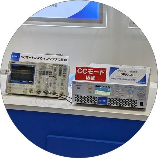 当社ブースでは、電力制御技術を活かした試験用交流電源、再エネ利活用に対応したパワーコンディショナ、および各種製造現場の要望に応える水冷電源をご紹介。