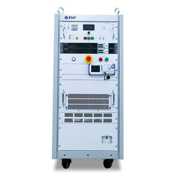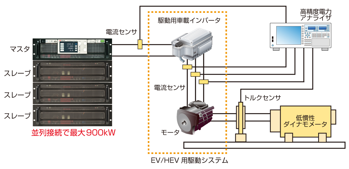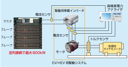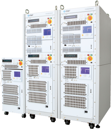 大容量化が進む車載用インバータの試験において、駆動システムの評価に大容量直流電源が必要です。WPシリーズは大容量に対応する上、オートレンジ出力により、システムにあわせた最適な試験電圧・電流を供給可能です。