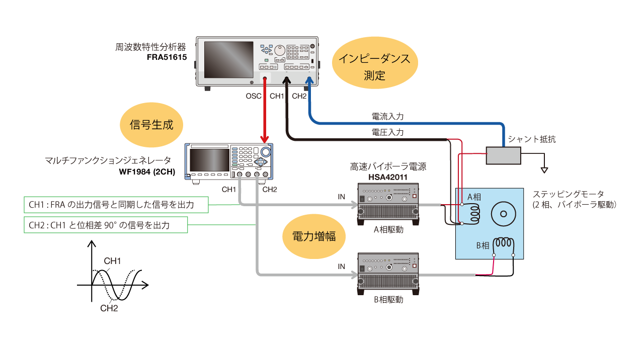 - CH1とCH2の出力(電圧10Vp-p、正弦波)を高速バイポーラ電源で電力増幅し、それぞれステッピングモータのA相、B相に印加