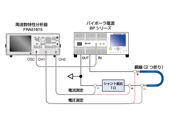 - FRA と定電流出力可能なバイポーラ電源(BP4610)を使用して、電流一定時の銅線のインピーダンスを測定します。