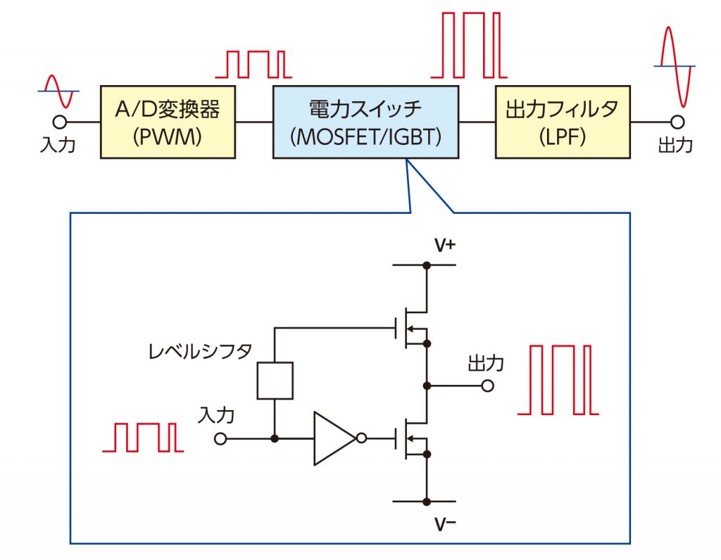 A級アンプでは、無負荷でもバイアス電流が流れるので出力段で損失が発生する。一方、D級アンプの出力段は、半導体素子のスイッチングなので原理的には損失を発生しない。したがって、スイッチングアンプは、高効率で小型化が可能である。