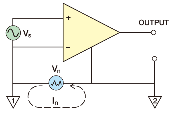 グラウンドループに商用電源信号( In )などが流れると、雑音信号( Vn )が発生し、差動増幅器に同相分として印加される。しかし、増幅器の出力に現れる同相雑音成分は極めて小さなものとなる(同相利得は小さく、理想的には零)。