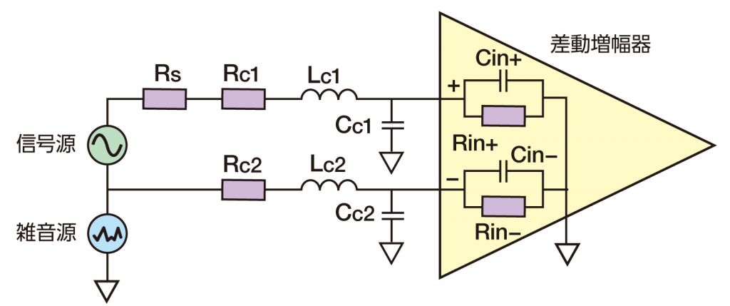 しかし、実際にはこれらの値が無視できず、雑音源が差動増幅器の+-に加わるときに電圧差が生じて、この差によってCMRRが劣化します。
