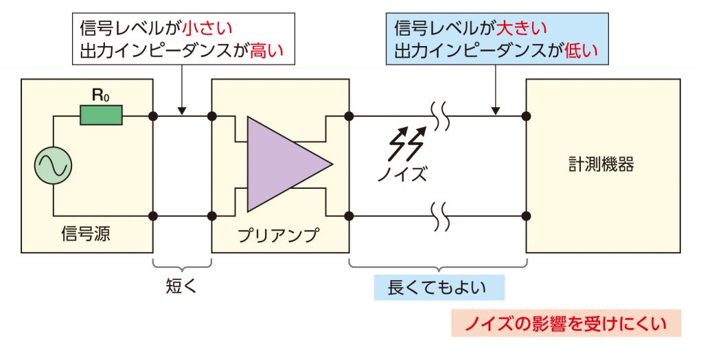 プリアンプは大別すると、計測機器の入力部で用いられるタイプと、単体で信号源のそばに設置するタイプがある。いずれも微小信号を扱うが、信号源が微小信号で、かつ出力インピーダンスが高い場合は、信号源のそばにプリアンプを設置するとよい結果が得られる(下図参照)。