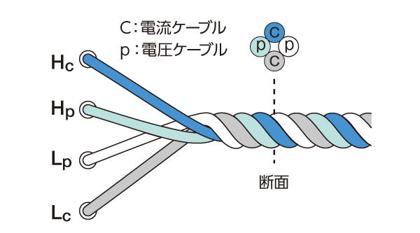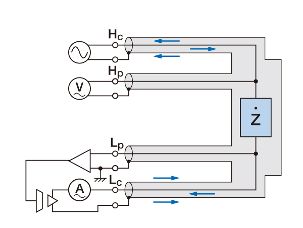 図2は4端子対法による接続図で、ケーブルのシールドを利用して、電流の往路と復路を重ねることで磁束の発生を抑え、電磁誘導による残留インピーダンスを低減する。