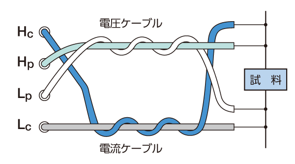 ちなみに4端子法でも、LCRメータと試料との間のケーブル接続を図3、図4のように工夫することにより、電磁誘導の影響を軽減することも可能である。