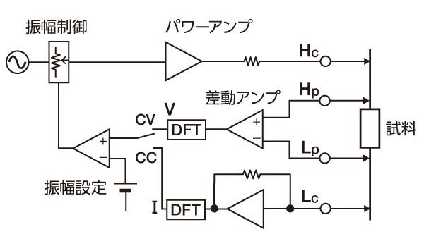 1番目の方法は、試料に加わる実効値電圧をDFT(離散フーリエ変換)で求めて振幅制御を行うので、目標電圧になるまでに数回の測定を要する。2番目の方法は、試料に加わる電圧波形そのものが元の正弦波と一致するように制御を行うので、瞬時に目標電圧が試料に印加される。大量に生産される積層セラミックコンデンサのように測定時間(タクトタイム)が重視される場合は、後者の方が有利である。