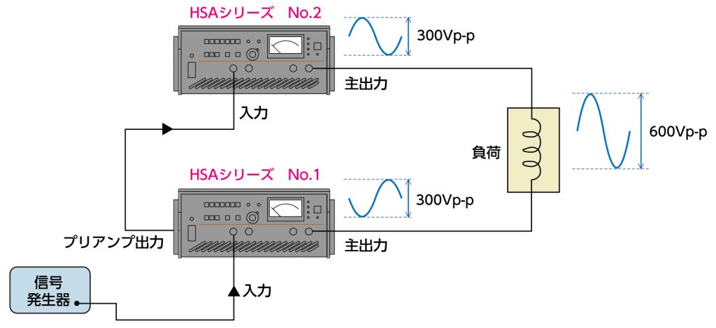 No.1の出力をNo.2の入力に加え、No.2をNo.1と逆相で運転します。負荷は各々の出力のホット側からとります。